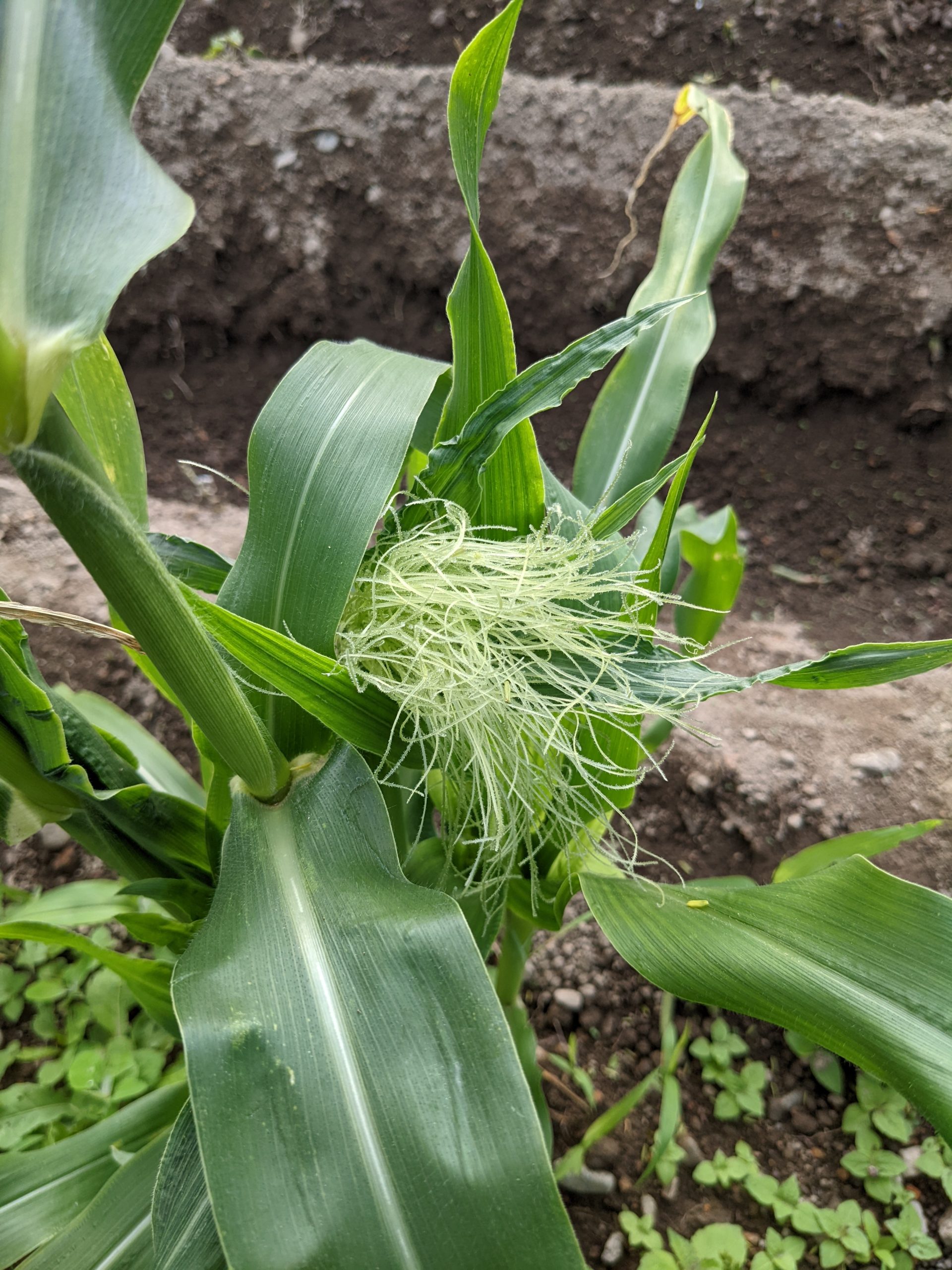 先に植えたトウモロコシは、背が低いまま雄花が出てきましたが、先週よりはすこし伸びました。1本だけ雌花も出ていましたので、別のトウモロコシの雄花で受粉させてみました。ちゃんとできているのかは分かりませんが、、、