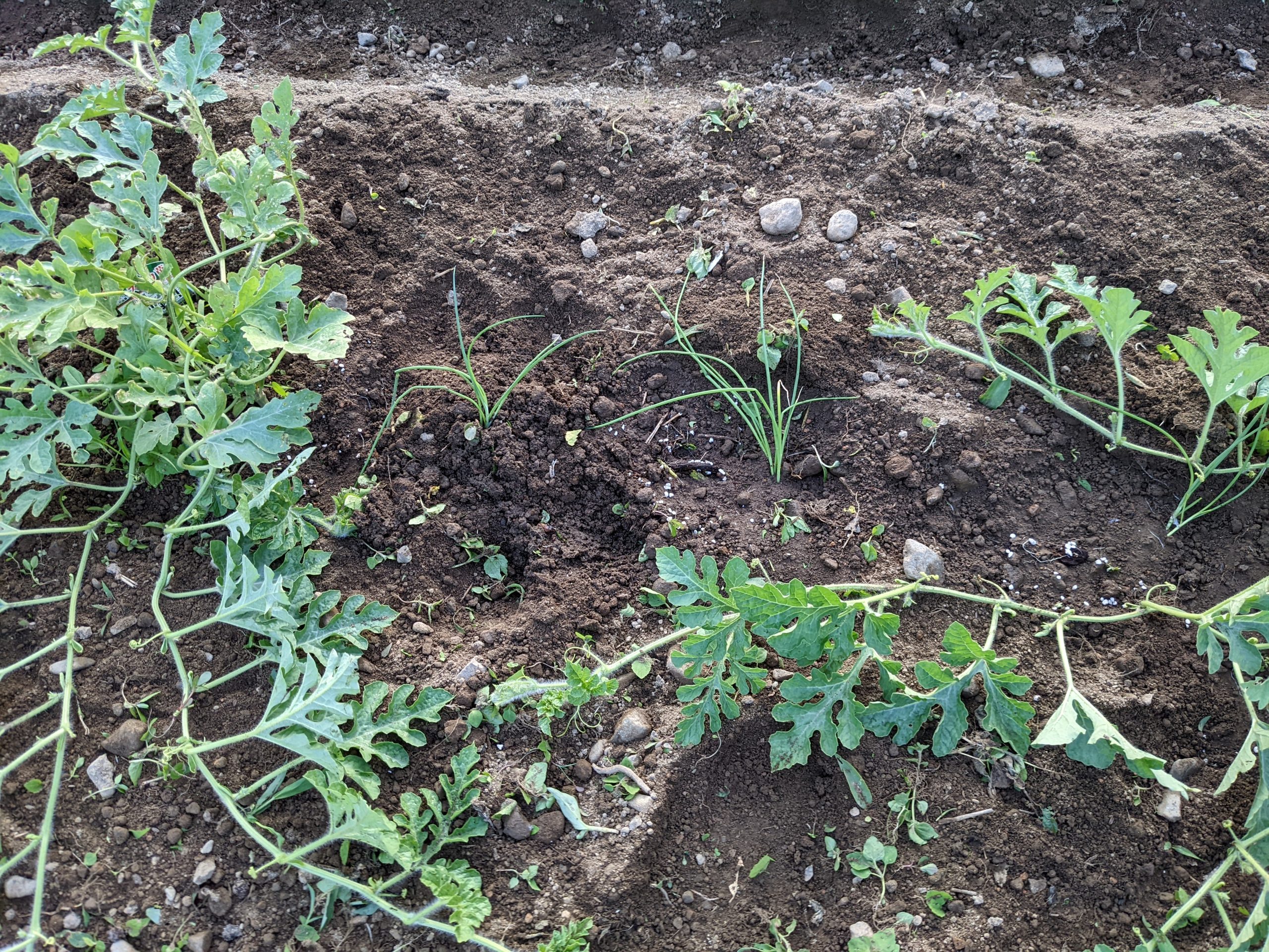 スイカ、トマト、トウモロコシの所は、草取りをしました。スイカの脇には、九条太ネギをバラして植えました。この取り合わせをコンパニオンプランツと言うそうです。スイカが病気にかかりにくくなるそうです。スイカは台木のカボチャ?の葉が大きくなっているのもあります。取った方がいいのかどうか???と思ってネットを見ると台木に負けるとあるので、取らないといけない様です。
