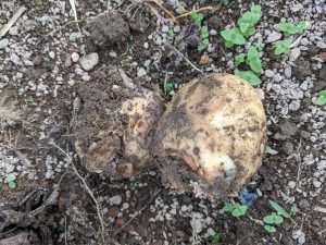 最初、1本だけ異様に枯れてきたので、病気かと思って気になっていましたが、やはり、イモが腐っていて病気だったように思います。腐ったイモは2つ、3つは小さいですが普通のイモでした。