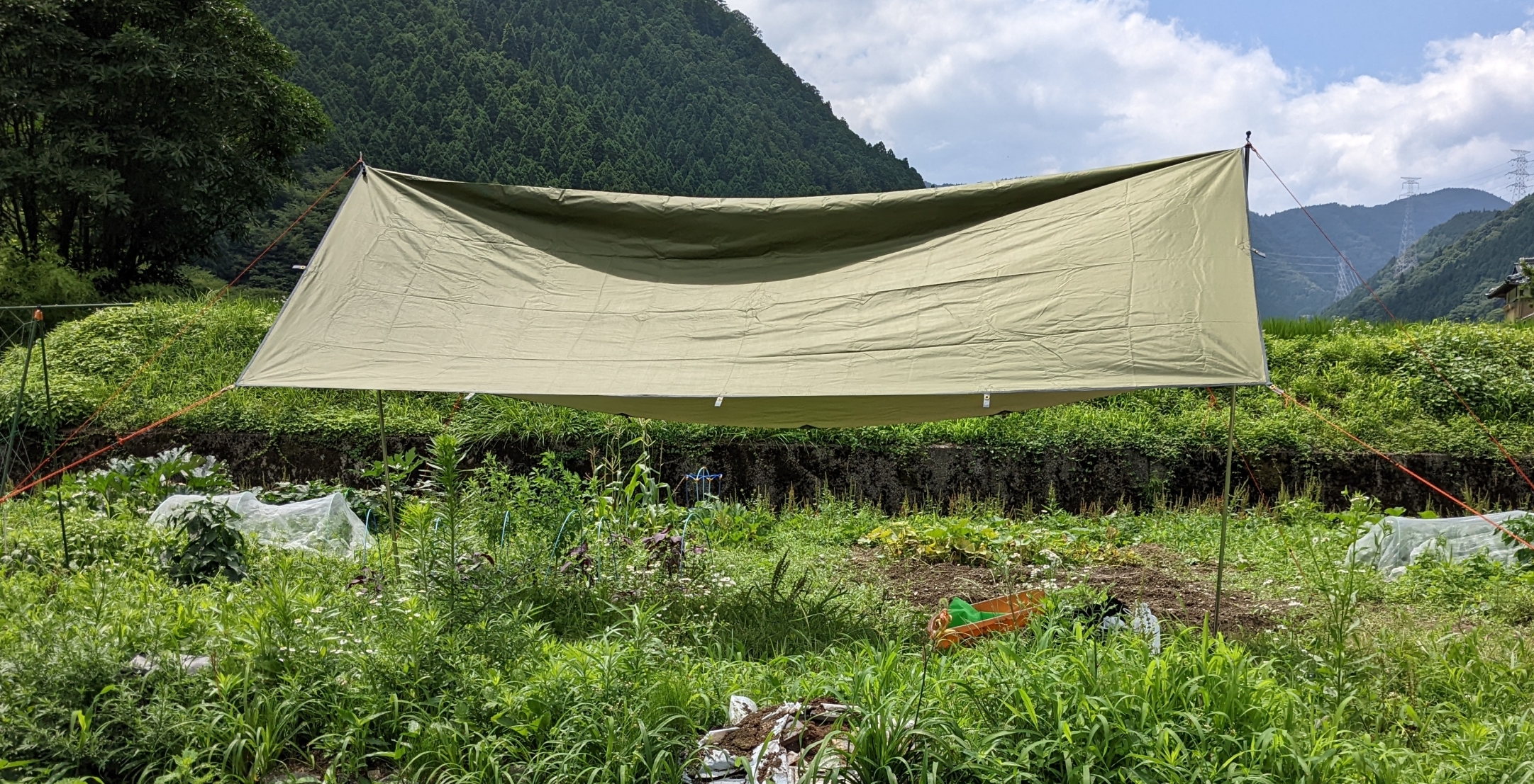 空調服は快調ですが、ずうっと日に当たっているのもと思って、タープを買いました。広げれば終わりというのが楽で良かったんですが、重いので普通のタープにしました。安かったですがいい感じでした。張ろうと思ったら、風が出てきて、先ほどのお父さんにお手伝いいただきました。肩の部分をもっと上げたいとなると、ポールがいりますが、何か1本ものを用意して置いておくのも有りかなと思いました。