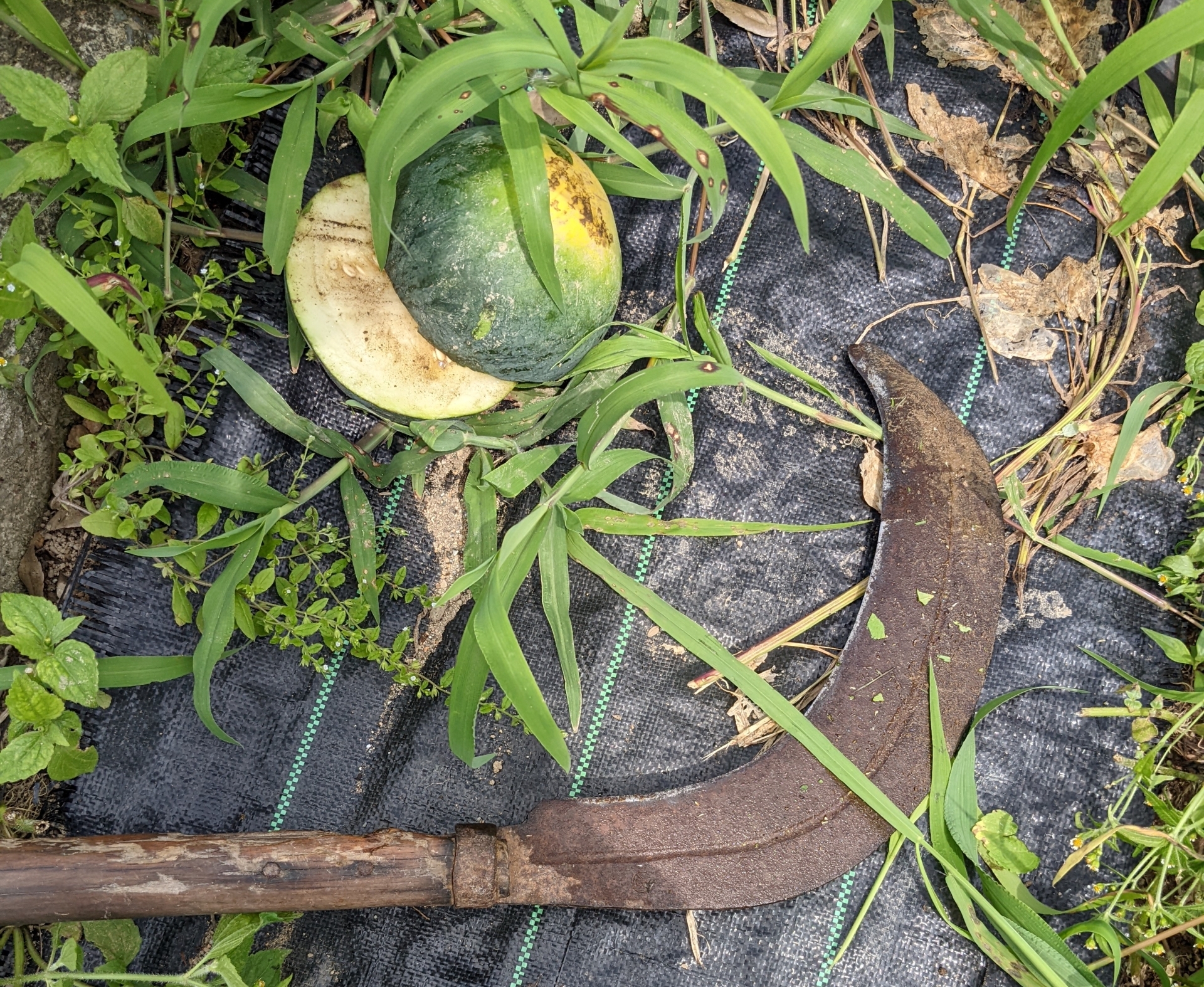 藤原先生が来られて、大きな草刈り鎌をお借りしました。うまく振れば草刈り機と同じような感じで刈れるのでこれも有りです試しに刈ってみたら、小さいスイカをまっふたつにしてしまいました。写真はありませんが、横にちょっと大きい黒鉄玉があって、とりあえずアライグマ?に食べられないように上に草をかけておきましたが、早急に対策を考えたいと思います。