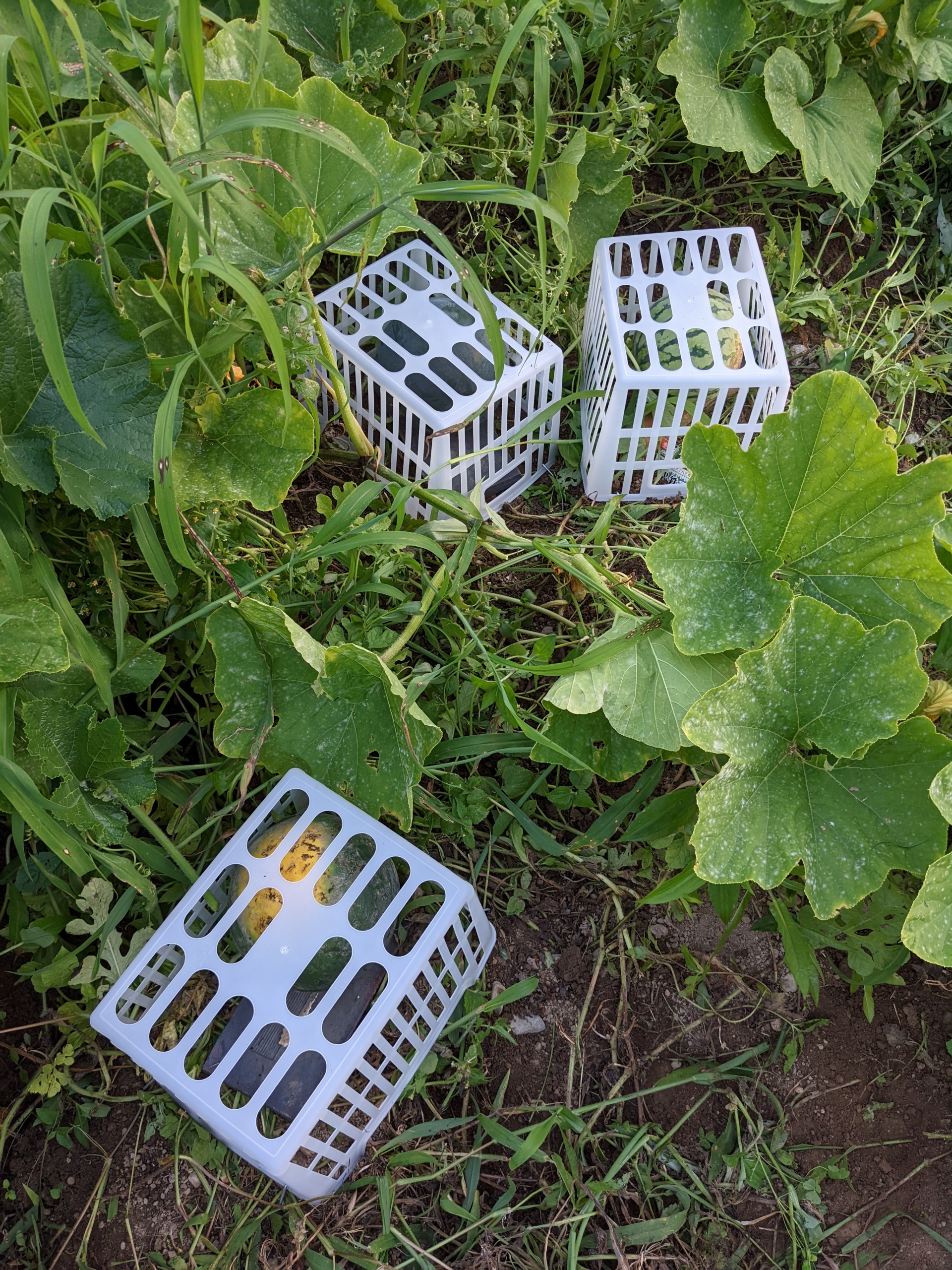 昨日、農園の様子を見に行きました。周りの草と、植えていないところの草がきれいに刈られていました。スイカも2本刈られてしまっていました。草ボウボウで、手入れしていなかったのでだめですね。先週スイカがいくつかなっているので、けものに食べられる前に、スイカを覆ってしまおうと、100均で新聞をまとめるかご?を3つ買ってきたので、とりあえず逆さまのかけて、ピンで留めておきました。