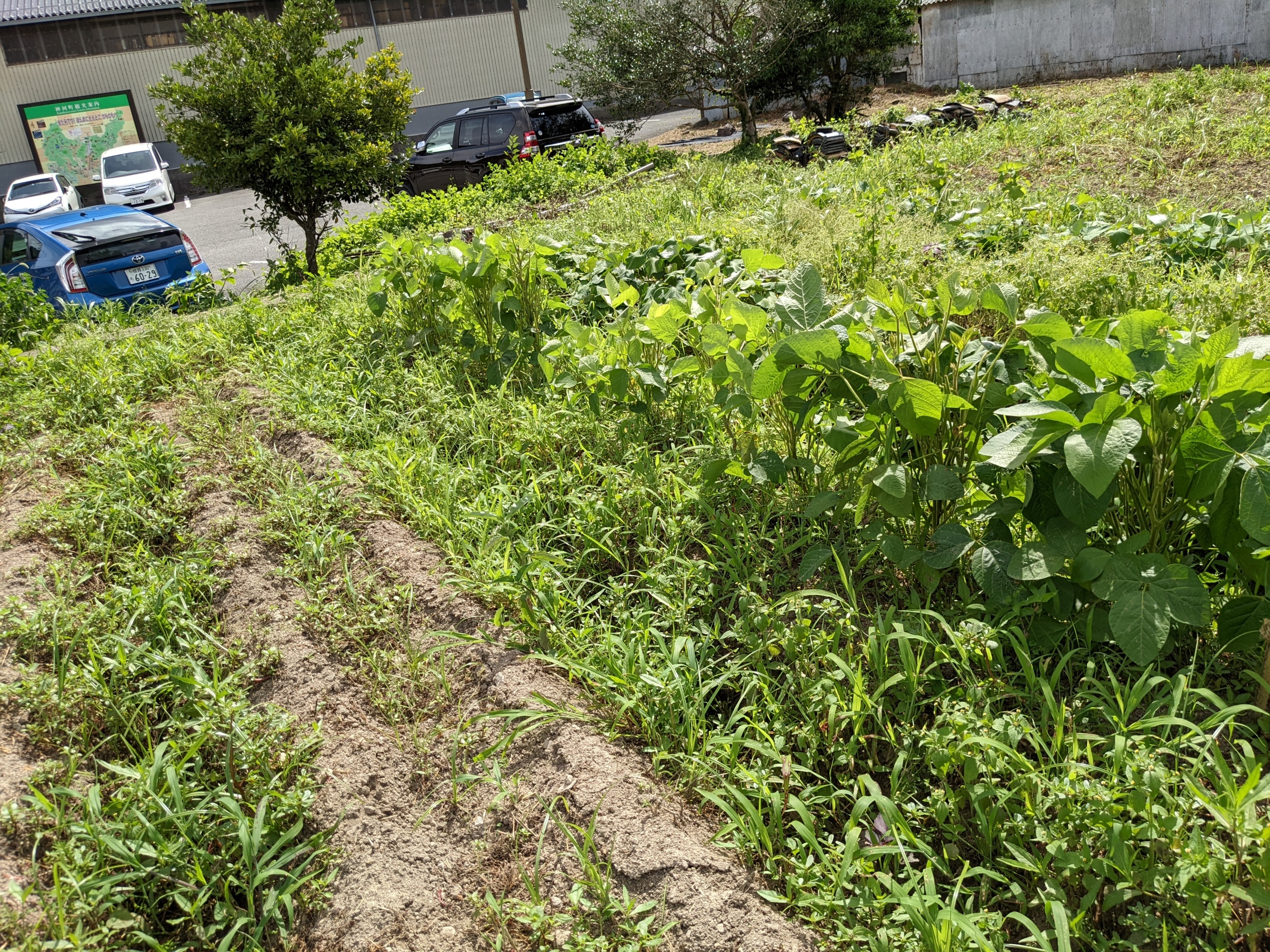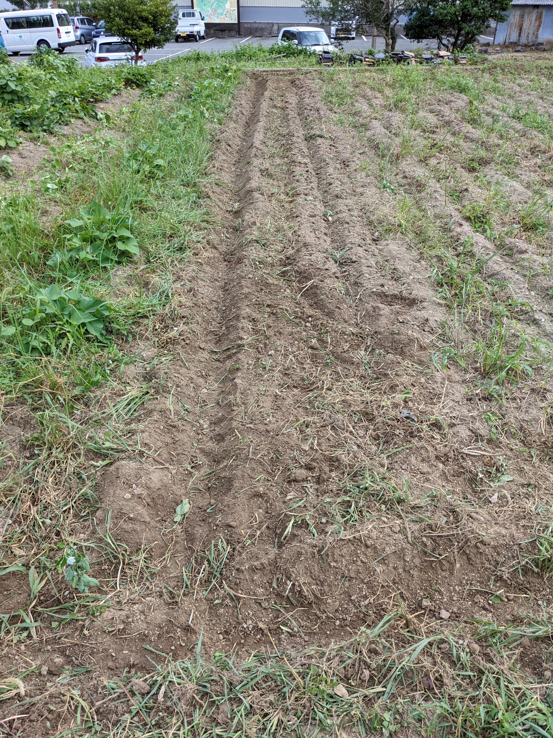 ネギなので、土を寄せていきますので、畝は作っていませんが、モグラよけにジャガイモの後6畝分くらい耕運機で溝を掘りました。中に入っていれば意味がないですが、横のサツマイモもモグラの穴に入ったネズミに食べられると言于話なので、溝を掘っておきましたが、浅くって、モグラが入っているようです。草のせいか、サツマイモの葉の生長もあまり良くないですが、食べられていなければいいんですが、、、