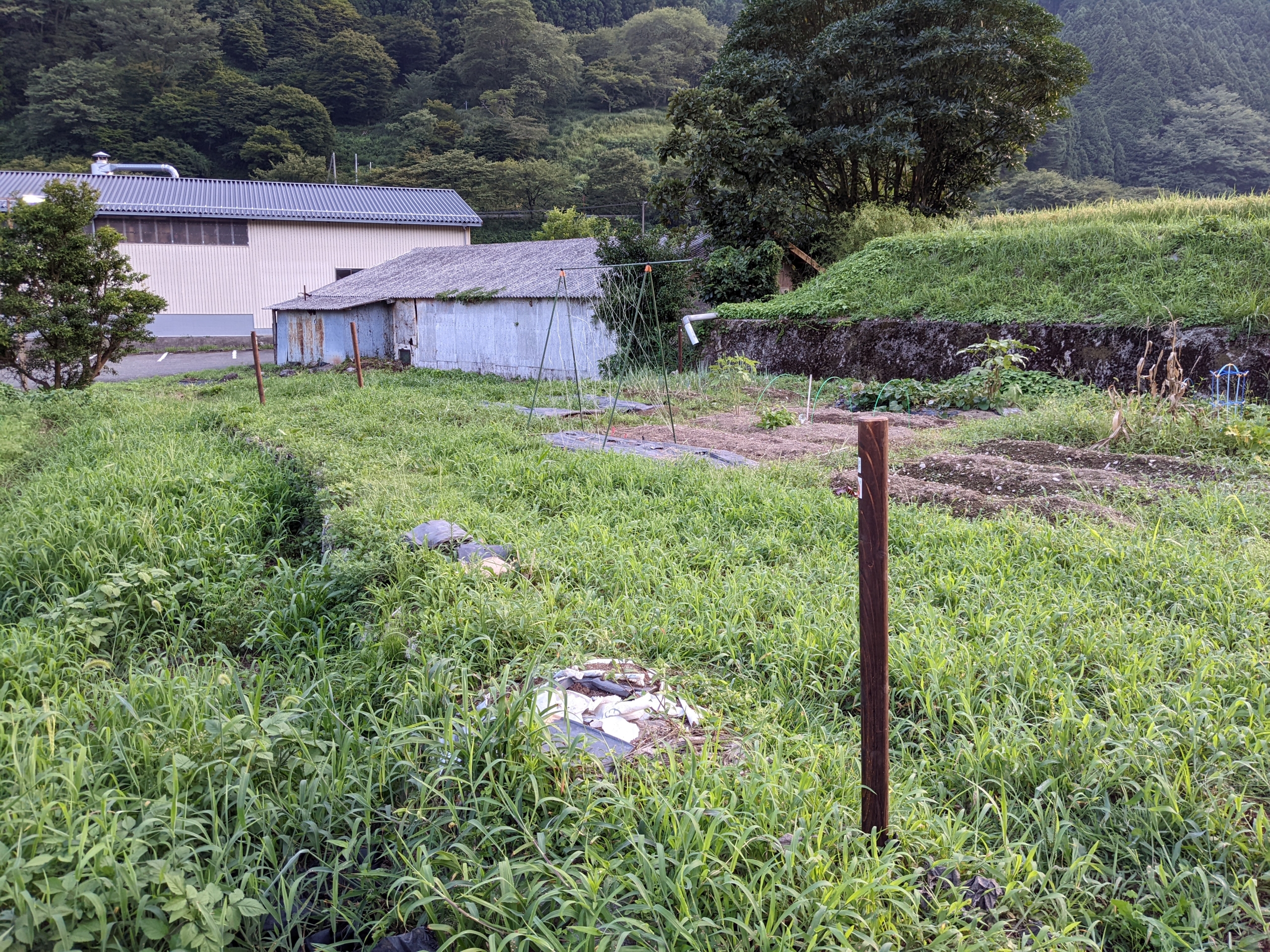 ホームセンターには、苗やその他いろいろ見に行っていますが、いろいろアイデアが出てきます。獣よけネットを竹使って張ろうかと思っていましたが、手に入れる算段もしないといけないので、とりあえず、アグロガーデンで売っていた半額の杭(60Φx1500mm)というのがあったので、とりあえず、角に立てました。