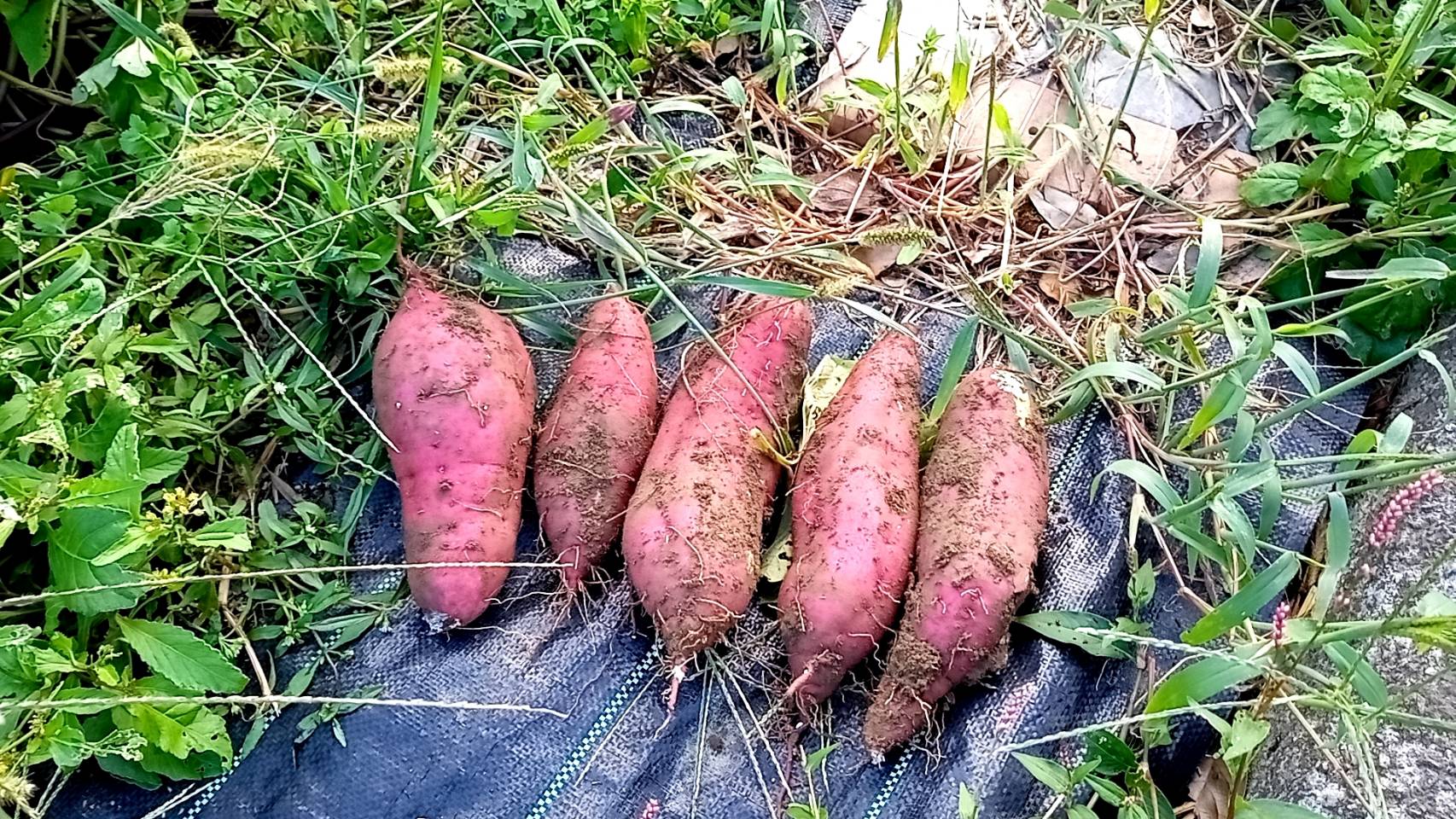サツマイモを植えたのが、6月初めだったので、120日~150日で収穫ということであれば、もう少し先かなと思いながら、試し掘りしてみました。三種類?植えてつもりですが、ちゃんと記録していなくて、「鳴門金時」と「シルクスイート」、「紅はるか」で、多分「鳴門金時」(左)と「紅はるか」(右)を発端だと思います。「シルクスイート」はあまり勢いがありません。