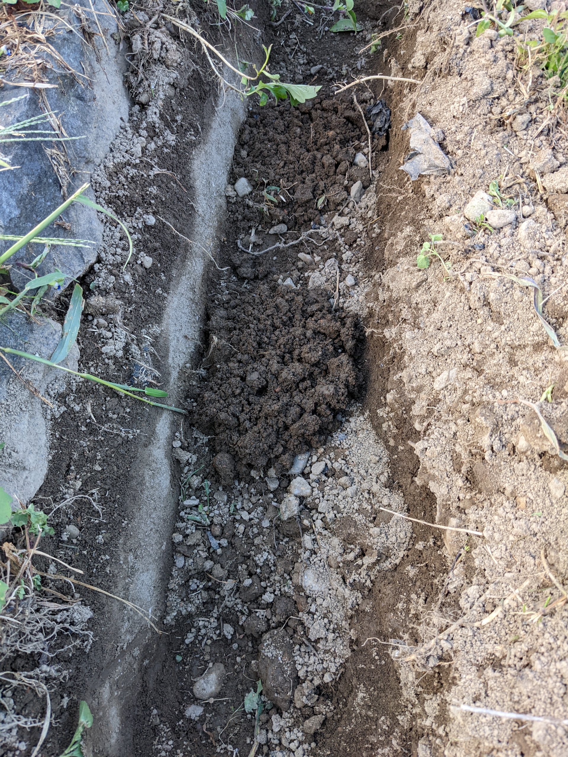 じゃがいもを植えるために、これまで植えていなかったところに畝を作ってじゃがいもを植えました。畑の端になるところなので、コンクリート枠と、石積みの塀の際に深い溝を作りました。掘り始めると、塀に沿ってモグラの穴が出てきたので、その下までと思って鍬でさらいました。ところが、あとでみてみると、石積の下にモグラの道があったのか、溝にモグラが通って土が盛り上がっていました。モグラは夜に動くのかと思っていましたが、昼間でも動くんですね。