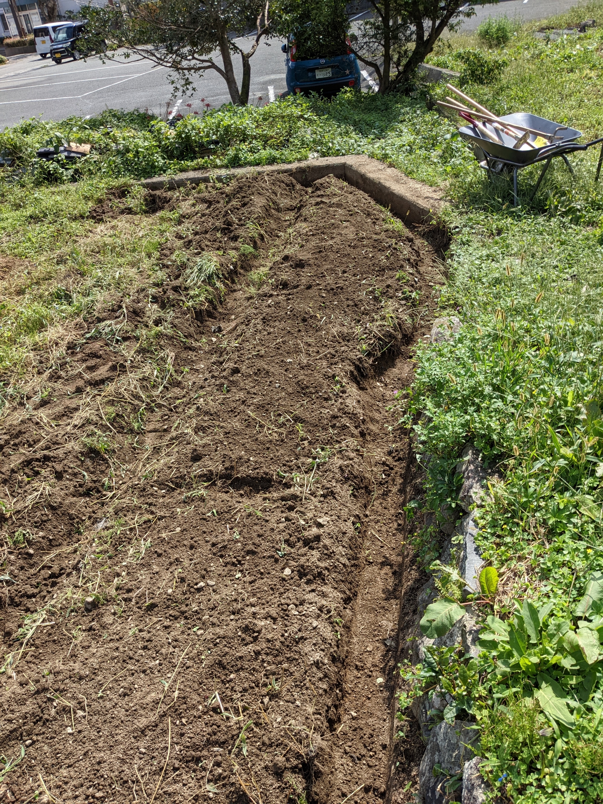 じゃがいもを植えるために、これまで植えていなかったところに畝を作ってじゃがいもを植えました。畑の端になるところなので、コンクリート枠と、石積みの塀の際に深い溝を作りました。掘り始めると、塀に沿ってモグラの穴が出てきたので、その下までと思って鍬でさらいました。ところが、あとでみてみると、石積の下にモグラの道があったのか、溝にモグラが通って土が盛り上がっていました。モグラは夜に動くのかと思っていましたが、昼間でも動くんですね。