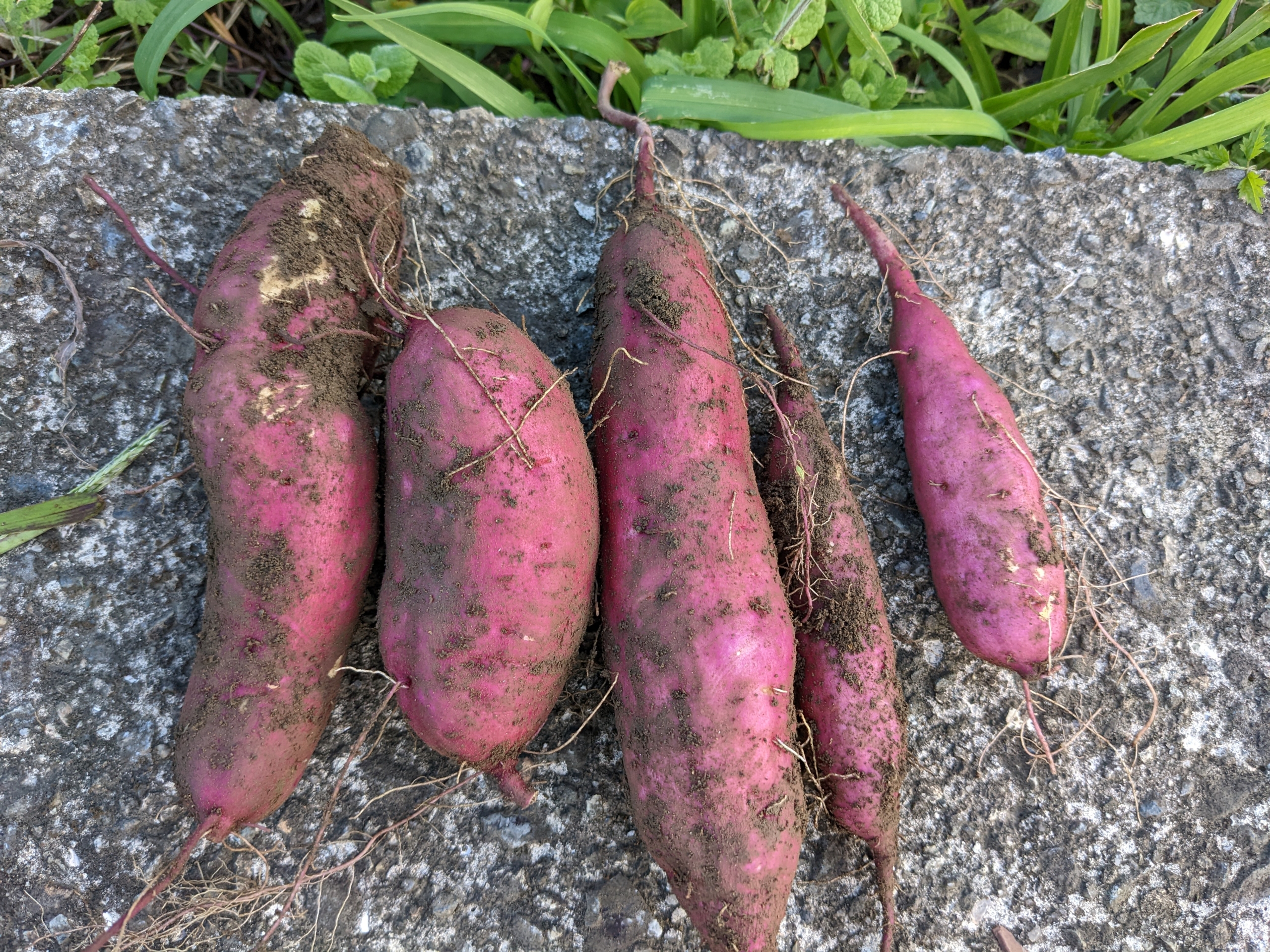 サツマイモを植えたのが、6月初めだったので、120日~150日で収穫ということであれば、もう少し先かなと思いながら、試し掘りしてみました。三種類?植えてつもりですが、ちゃんと記録していなくて、「鳴門金時」と「シルクスイート」、「紅はるか」で、多分「鳴門金時」(左)と「紅はるか」(右)を発端だと思います。「シルクスイート」はあまり勢いがありません。