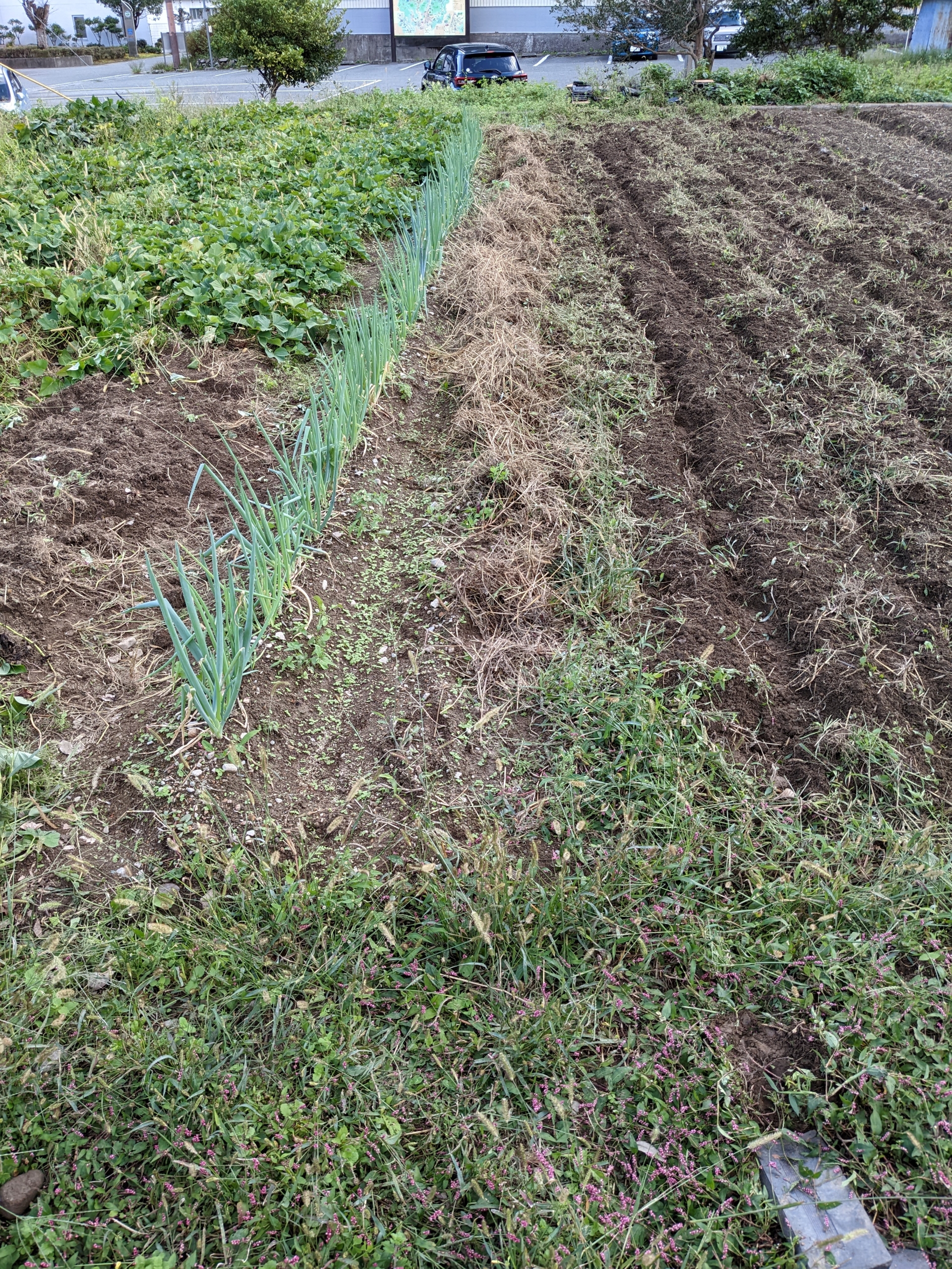 右側には、右の方の草を刈ったものを集めていましたが、邪魔なので一か所にまとめました。刈った草のあったところは、比較的草の量も多かったためか、新しい草は生えていませんでした。多少草が分解しているようで、水分があるからか、微生物のおかげか土も柔らかくなっているような感じでした。最近、自然農のYoutubeをよく見るのですが、草の肥料としての能力が割と高そうですので、刈った草を肥料にできるように、畑の中に箱を置いて、その中で分解するようにしてみようと思います。