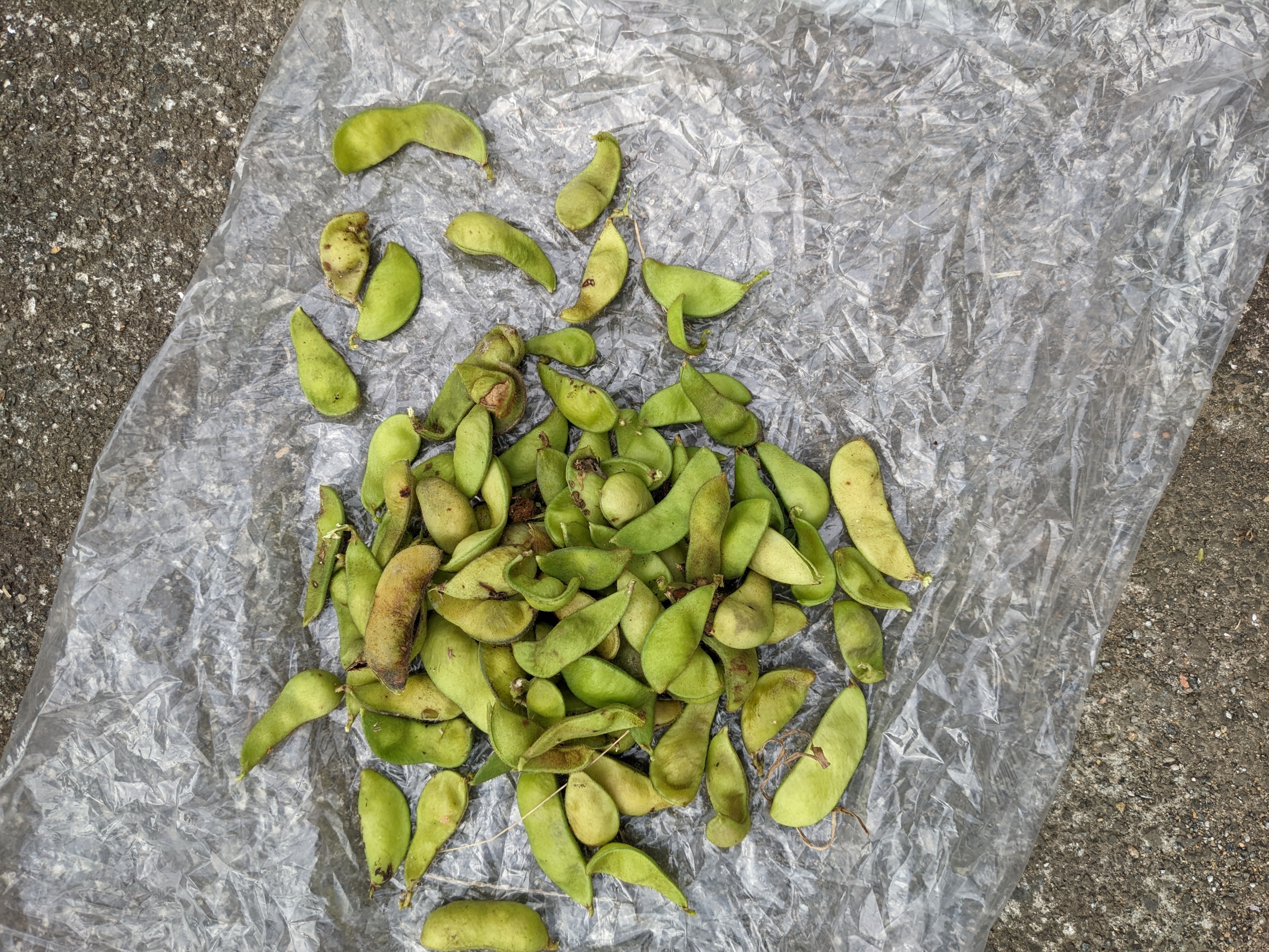 枝豆は、シカに葉を食べられてからよくそだってくれたのですが、倒れていることに気づかずに変な曲がり方をしてそだちましたが、ほんの少しだけしか取れませんでした。房も豆が1つだけのがほとんどです。リンが足りないと教えてもらいました。