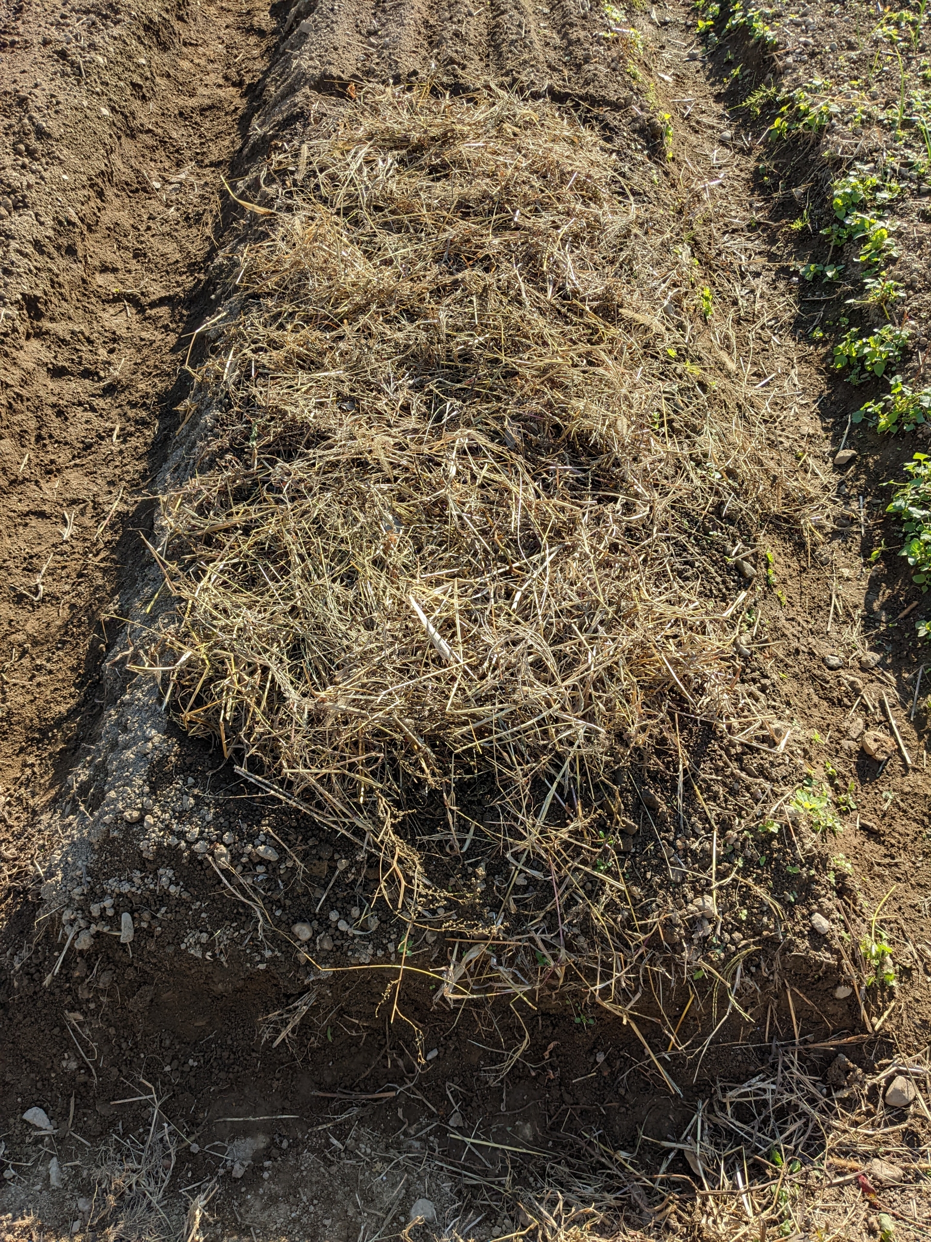 午前中は仕事でしたが午後からあいたので、タマネギの様子見とこれからでも植えられそうな種を買ってきて植えました。買った種は、ぐんぐん育つ!極早生ほうれん草トライ、つるありスナック、年中栽培ができる小松菜、ころころラディッスミックス、サラダ京水菜、時なし五寸にんじんです。実際に植えたのは、スナックエンドウと、ほうれん草です。ほうれん草は、タマネギの畝の端に植えました。ちょっと遅い気がするのと、発芽までに水分が必要と言うことだったので、乾燥を防ごうと刈っておいてあった草を上一面に掛けてみました。