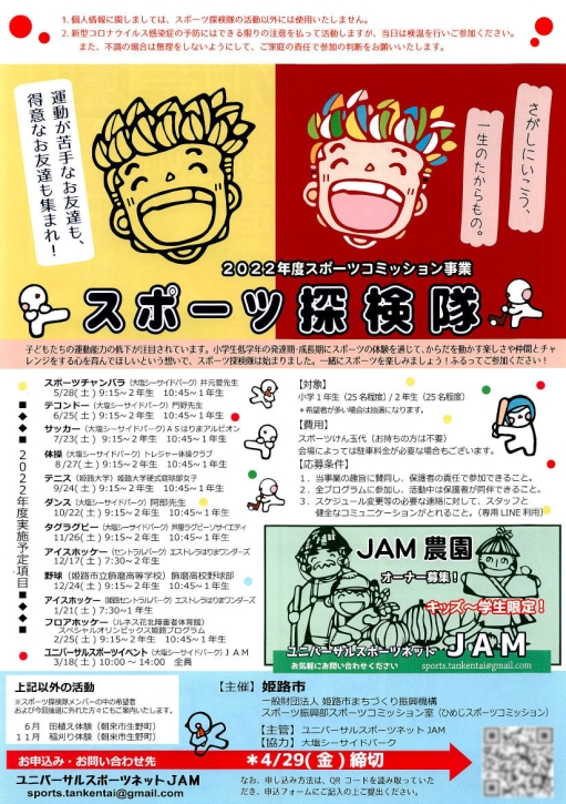 現在は、姫路を中心に小学校低学年を対象に行っているスポーツ探検隊の参加者を中心に募集を行っています。