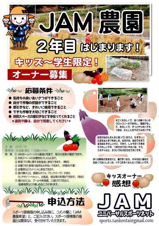 この、JAM農園もその中から2021年の8月に始まりました。たまたま、兵庫県神河町の畑2枚をお借りできることになり1枚は子どもたちに経済的なことも考えながら自らの食を考える農業を行ってもらおうと、子どもたちをオーナーとして貸農園スタイルで1区画5mx2.5mを貸し出しています。もう1枚は、素人ながら私たちがいろいろなものを栽培しデータを集めるためと、収穫祭などを行えるように、いろんな野菜を栽培しています。